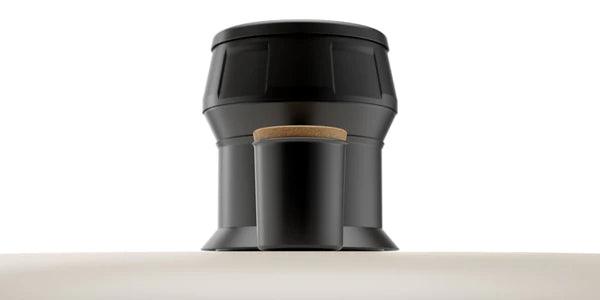 A black anodised aluminium funnel with a cork top, engineered with precision to inject just the right amount of water into the oven and create steam on entry.