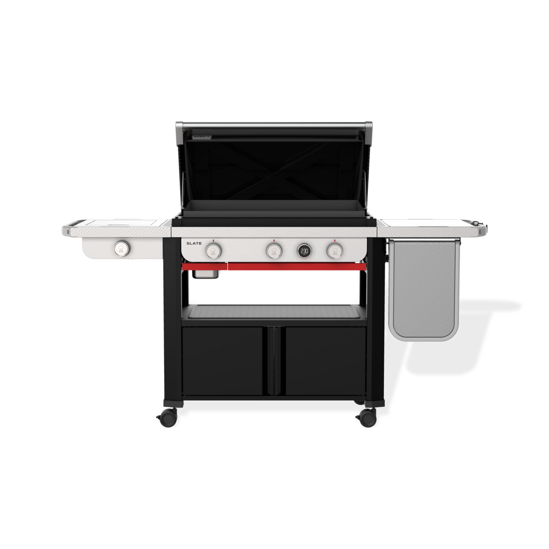 The Weber Slate GPSB 76cm Premium Griddle Gas BBQ's stick-resistant, porcelain-enamel cooktop is ready to cook on right out of the box so juicy smashed burgers, flavoursome stir fries, beautifully seared seafood, veggies, and many more memorable cooks can easily be created. The left hand side shelf on the model integrates a powerful side burner which will help to maximise the potential for more mouthwatering menu choices giving additional cooking space for the sauces and sides while right hand side table will easily extends to the front to hugely increase the amount of space available for both food preparation and plating up or serving.